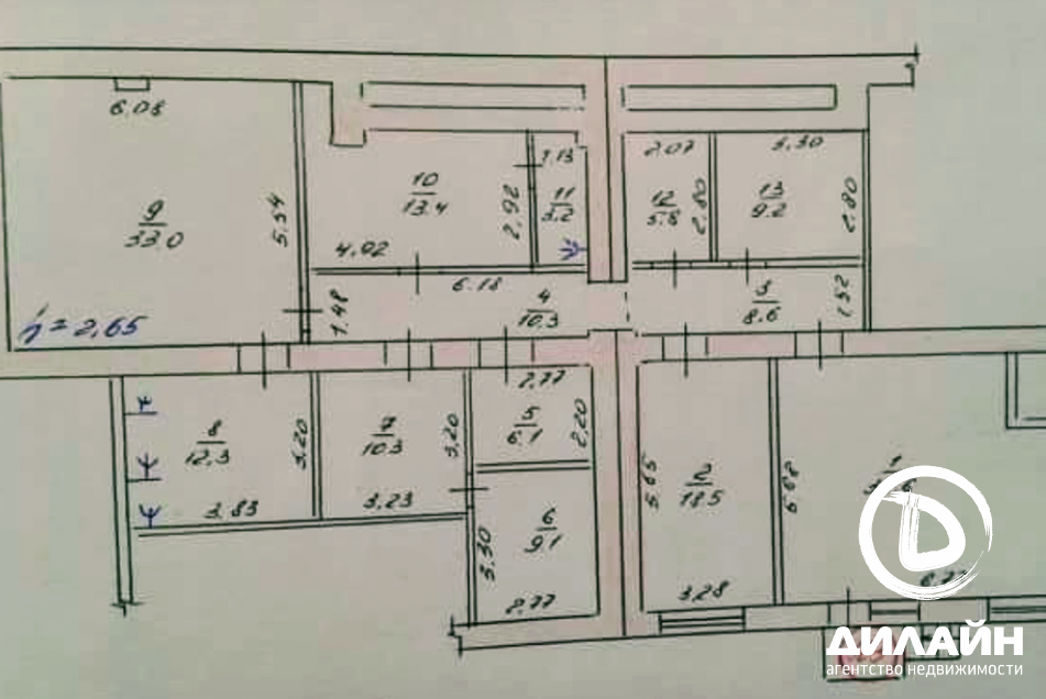 Общая площадь 10-ти комнат – 172 м.кв. Практичная планировка. Отдельный выход на фасаде здания.