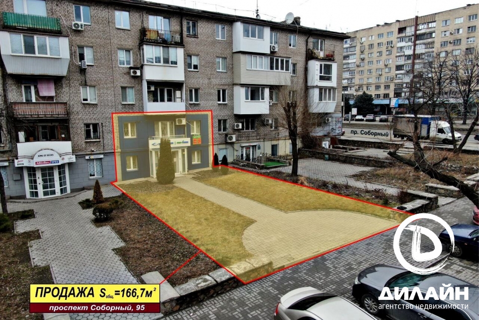 Продаётся коммерческое помещение, расположенное на проспект Соборный 95. Отдельный вход с фасада здания. Общая площадь помещений – 166.7 м². Практичная планировка (копия плана БТИ прилагается). Разрешённая электрическая мощность – 15 кВт. Центральное водоснабжение и канализация. Отопление – центральное. Кондиционеры. Охранная сигнализация. Ландшафтный дизайн. Парковка для автомобилей. Ближайшее окружение к объекту продажи отражено на панорамных снимках. Благодаря своим объёмно–планировочным характеристикам и местоположению помещение может успешно использоваться для размещения офисов, медицинского центра, салона красоты. ЦЕНА – 158.000 $