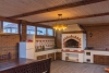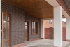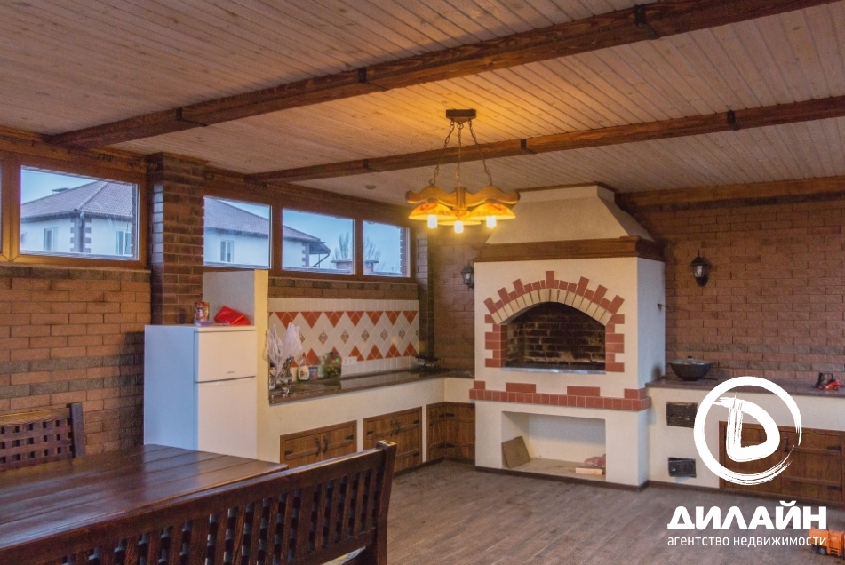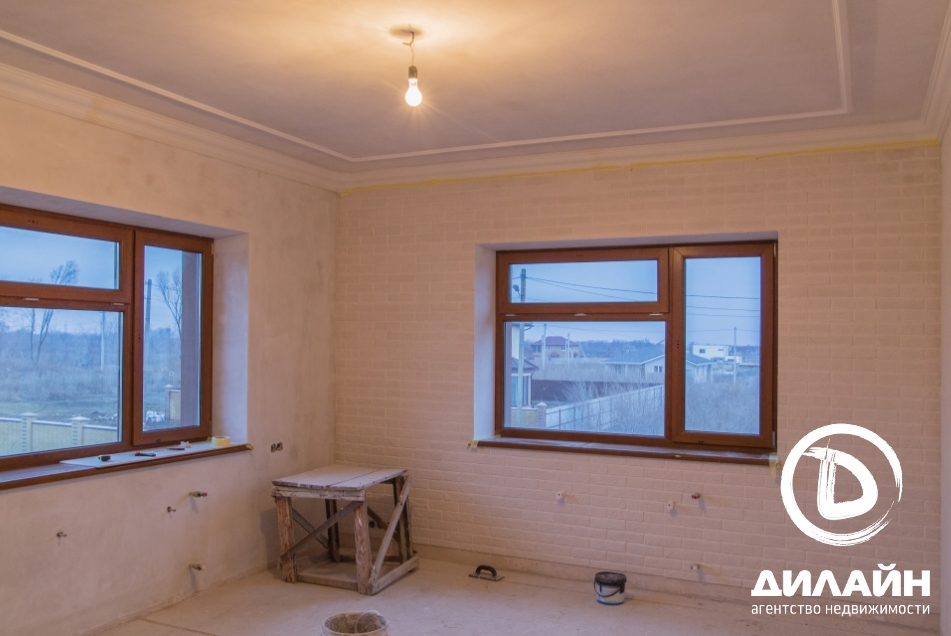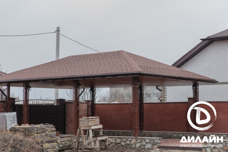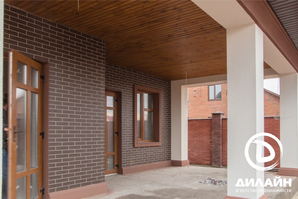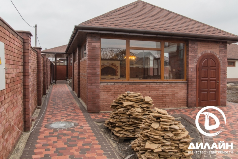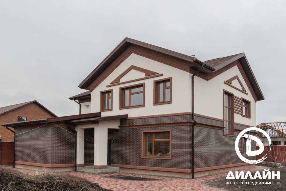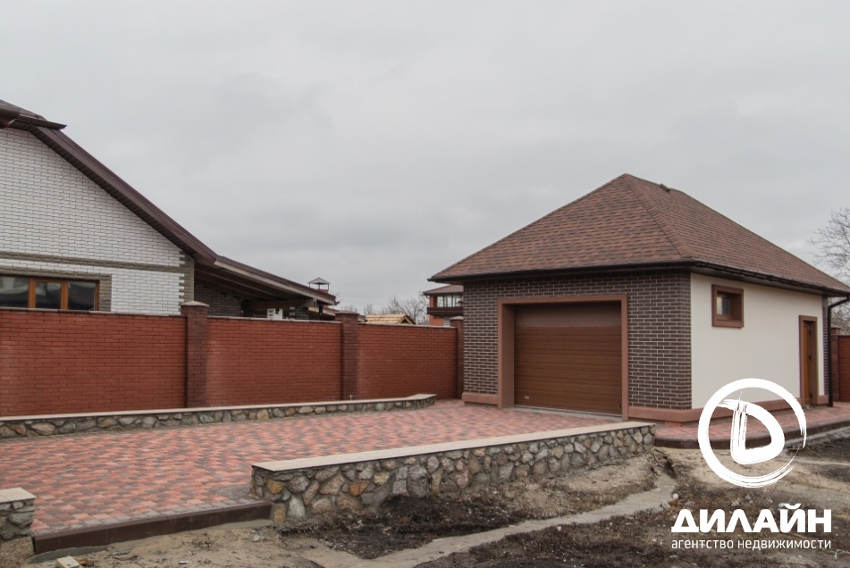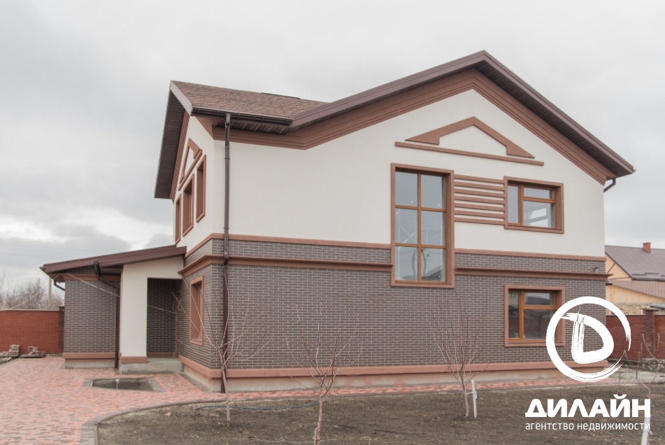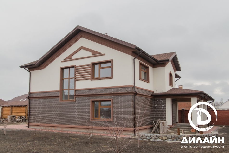 Строение из красного кирпича. При отделке фасада использовалась декоративная штукатурка. На территории участка разместилась крытая летняя кухня с мангалом, капитальный навес, гараж на две машины с автоматическими воротами. Дом построен в два этажа. Внутренние отделочные работы выполнены на 90%. Материалы и сантехника заказаны.